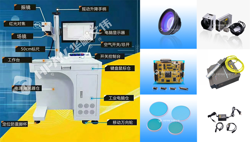 光纖激光機柜、工控電腦、光纖激光器、高速掃描振鏡、打標控制軟件卡、紅光頭及合束鏡片、開關按鍵等部件組成。其中光纖激光器為主要核心部件。